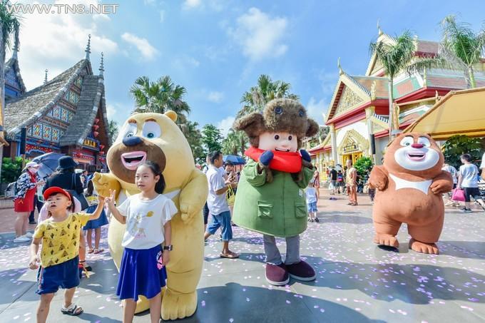 入园第一站,映入我们眼帘的便是拥有十国风情的东南亚风情街,在这里小编推荐玩玩看看拍拍30分钟左右,开园后入园入口处有短暂的迎宾互动,将有十国风情的小哥哥和小姐姐以及熊出没明星家族等待着大家。