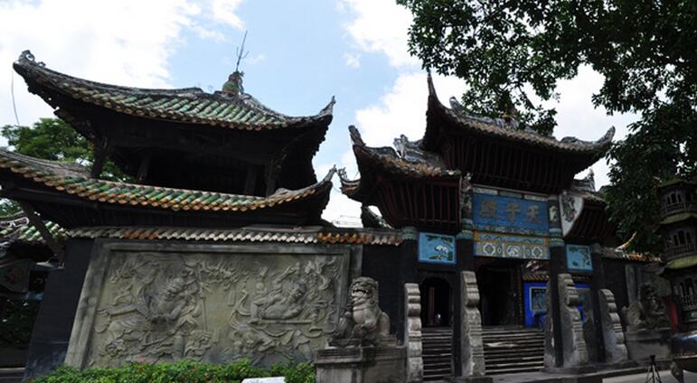 座西向东,最早修建于西晋,距今约有1600多年历.史,现存的天子殿是清康熙三年(1864年)重修的,距今有三百多年历史。全殿占地2431平方米,由牌坊、山门、殿堂三部分组成,对称地排列在一条中轴线上。牌坊为木石结构的三重檐坊,高约10公尺,山门为重檐歇山式屋顶,两边的钟鼓楼均为四角攒尖顶,殿堂为砖木结构,硬山式屋顶,穿逗式梁架。该殿系鬼城的核心部分,也是名山上建筑年代最久,面积、规模最大,保存最完整的一座庙宇。