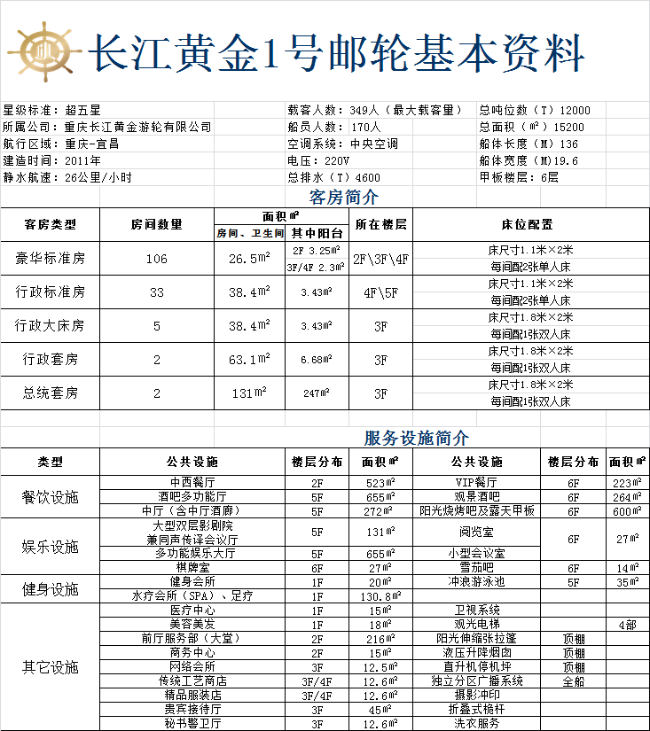 有这样一艘邮轮,她是目前世界上最大、最先进的内河豪华邮轮,于公元2011年5月28日在重庆首航!她改写了世界内河的航运史!从此开启了三峡万吨级涉外豪华邮轮海洋化时代的新纪元!她的名字叫“长江黄金1号”邮轮! 她是根据国家旅游局2008年发布《内河游船星级的划分与评定标准》,并参照海洋邮轮的标准,采用国际先进的理念和技术而设计建造第一艘船,以匹配举世闻名的长江三峡国际黄金旅游线,堪称世界内河豪华邮轮的旗舰.