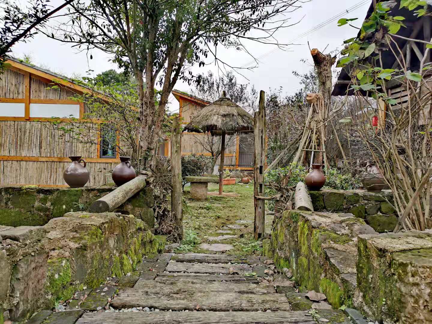 沿可以居大院左侧斜上坡,半坡上有三栋独立的玻璃茅草亭特色民宿房,朝阳而居,房名分别用缘来、无为和结庐来表述了悠然的宿主心境。右斜下坡是一条小径,道路两旁是各种花果树,树下是蔬菜地。过乡愁大道,是生态别院,共五栋并每栋分别独立成院,仅由名字就可以揣测出生态别院的所处环境了,河畔里、听风、揽月、沐雨、泛舟。